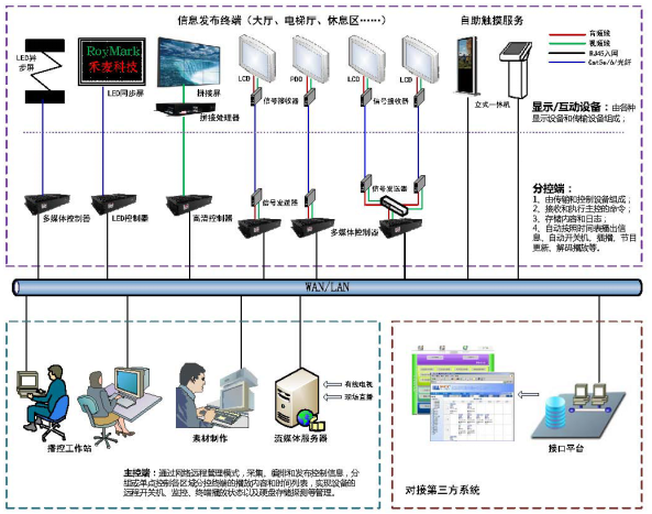 多媒体发布系统将LED屏幕作为显示设备,统一集中到系统网络内部进行管理控制,再根据LED调整其显示比例,通过主控端统一来编排节目和播放,若项目有n块LED屏,无需分n个管理工作站。