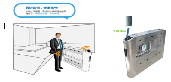 人员将识别卡装在包里或身上口袋,接近已被授权的门禁设备时自动被识别,自动开闸,将人员的出入记录自动上传至服务器作为进出某一区域的依据。
