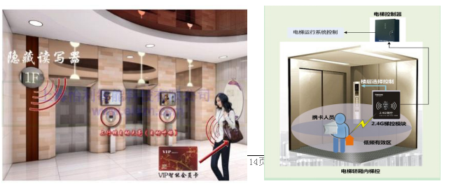 对不同人员所携带的标签设置与其相对应的门禁通行权限,人员将识别卡装在包里或身上口袋,接近电梯附近自动感应呼梯,并识别楼层权限控制电梯到达门禁卡相应的楼层。