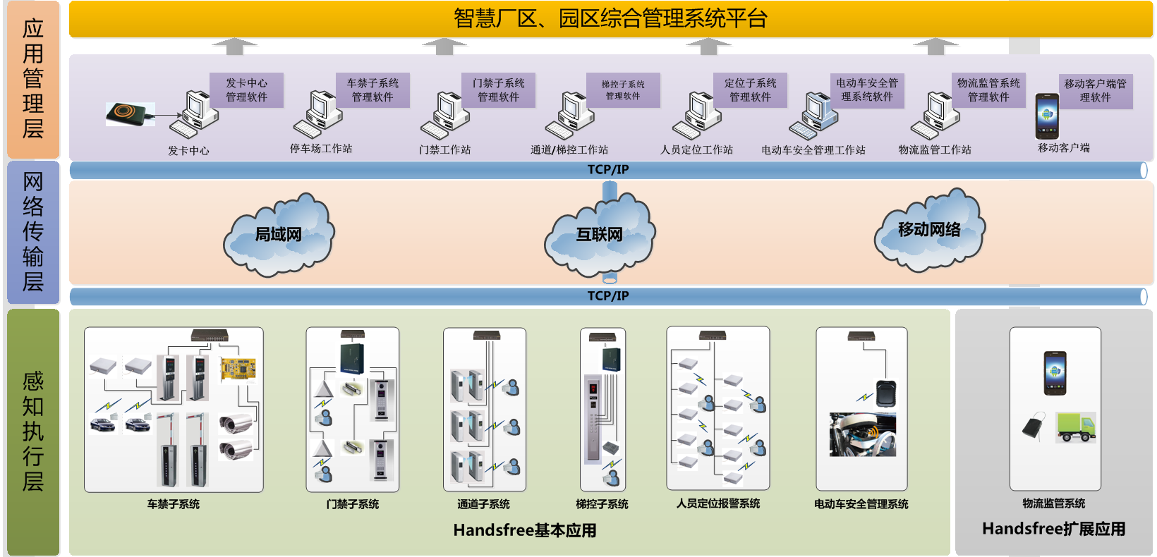 针对园区环境的Handsfree基本应用由8个子系统构成,扩展应用由2个子系统构成。每个子系统可以独立运行,也可以进行系统联动,构建统一的应用管理平台。根据人员、车辆方面在各个子系统内的应用介绍如下: