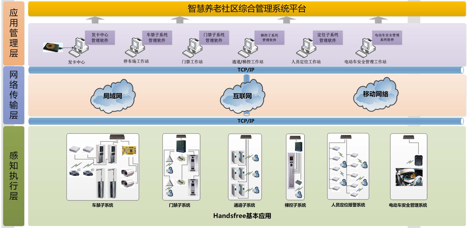 养老社区智能化应用系统架构,这些子系统可以独立运行,也可以构建综合管理平台。如下图所示: