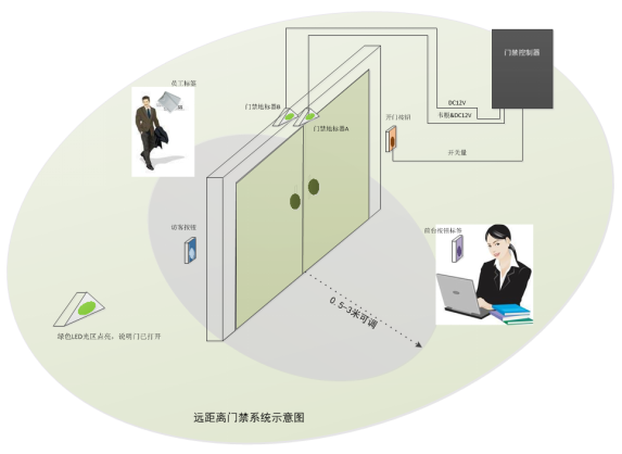 1、人员携带门禁卡(挂在胸前)以正常步行速度,走到门前1-3米(范围拨码可调),自动完成门禁卡的远距离识别,通过身份认证,则系统进行开门操作。