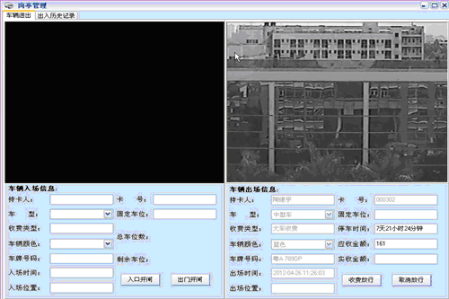 岗亭车辆出入监控:可实时联机对出入停车场的车辆进行监控、进出拍照、计算费用。