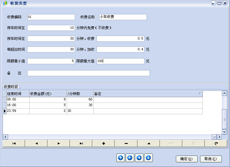 收费类型:支持步进收费方式和按时段收费。收费时段有输入以收费用时段计,没有输入以步进收费计。步进收费类似的士收费方式,停车时间在多少分钟收费多少元,每超出多少分钟加收多少元,常用于小区停车场。按时段收费,按用户输入的时段进行收费,常用于商场停车场,两者都支持最小限额、最大限额。