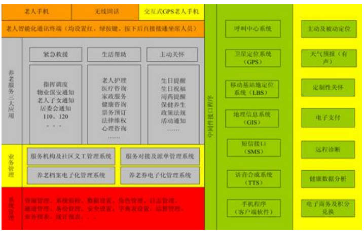 有效整合通讯网络、智能呼叫、互联网等科技,北斗技术手段,以信息化、智能化呼叫 救助服务平台为支撑,以建立老年人信息数据库为基础,以提供紧急救援、生活照料、家 政服务为基本服务内容,以社区为依托,有效整合社会服务资源为服务主体,建立完善的 居家养老服务体系,打造真正意义上得“没有围墙的养老院”。