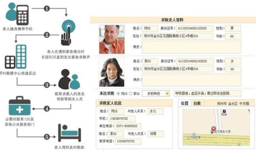 ① 紧急救援服务流程 ② 坐席弹屏显示老人档案、定位应用