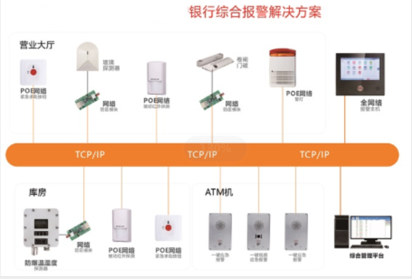 仲子路在报警应用领域多年的丰富经验,结合银行报警应用的实际需求,推出了一套网络化综合报警解决方案,能够有效提升银行(营业厅、ATM机、库房)的安防等级,及时保护银行内人员及财产安全,打造现代化安全银行。
