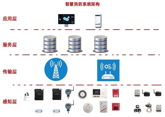 智慧消防系统整体架构有物联网硬件探测器、传感器组成的感知层、NB、lora、网关、4G、5G等多种网络传输模式应用的传输层,以及服务层、应用层。