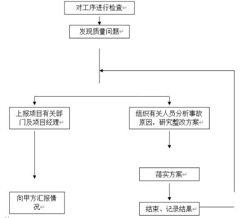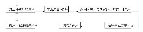 说明:项目经理全面负责工程质量的检查工作;由施工技术部、物资设备部对检查中发现的工程质量问题进行研讨并编写纠正办法上报项目经理下发作业队;作业队组织相关人员按纠正方案进行处理,确保方案的落实;安质环保部组织技术工程师、作业队队长对纠正后的工程进行验证。