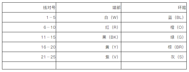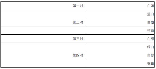 按顺序组合,如1-5线对则有:白蓝、蓝白为第一对线;白橙、橙白为第二对线;白绿、绿白为第三对线;白棕、棕白为第四对线;白灰、灰白为第五对线。其它依次类推。安装终接按顺序按此色标进行,方可保证连接的正确性。