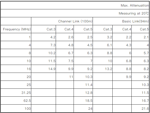 对垂直子系统中的多芯双绞线之衰减测试,其结果不大于下表所示的值视为通过。