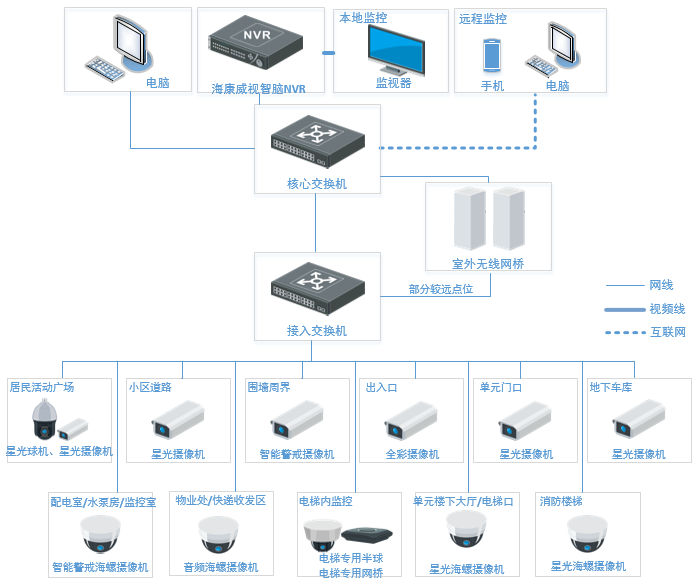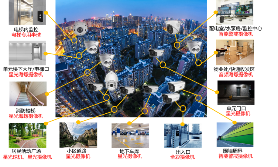 本方案覆盖小区围墙周界、出入口、道路、居民活动广场、地下停车场、电梯等重要监控区域,主要采用智能警戒摄像机、全彩摄像机、无线网桥等设备,实现重点区域实时监控,报警信息准确推送,提高小区物业管理效率,更大限度保护业主生命财产安全。