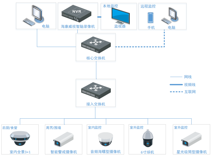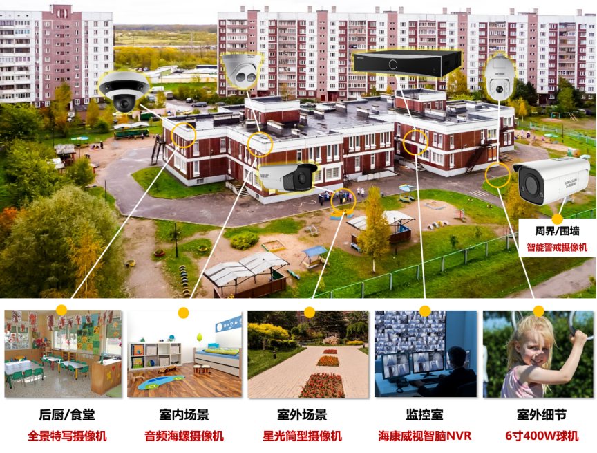 本方案适用普通中小型幼儿园的校园监控系统建设。针对幼儿园的室内、室外活动场所、后厨、食堂等,进行全面监控覆盖。同时针对园区周界围墙,采用智能警戒监控方案,摄像机端可以自动对进入监控画面的人体进行检测,同时发出声光震慑,驱离不法分子。并且,监控室录像机端会第一时间收到报警信息,提醒安保人员做出应对措施,从而有效保障校内学生安全和学校财产安全。