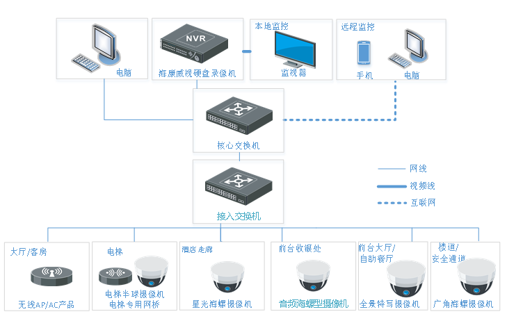 监控查看方式采用本地查看和远程联网查看相结合的形式,方便管理者对酒店进行远程管理;