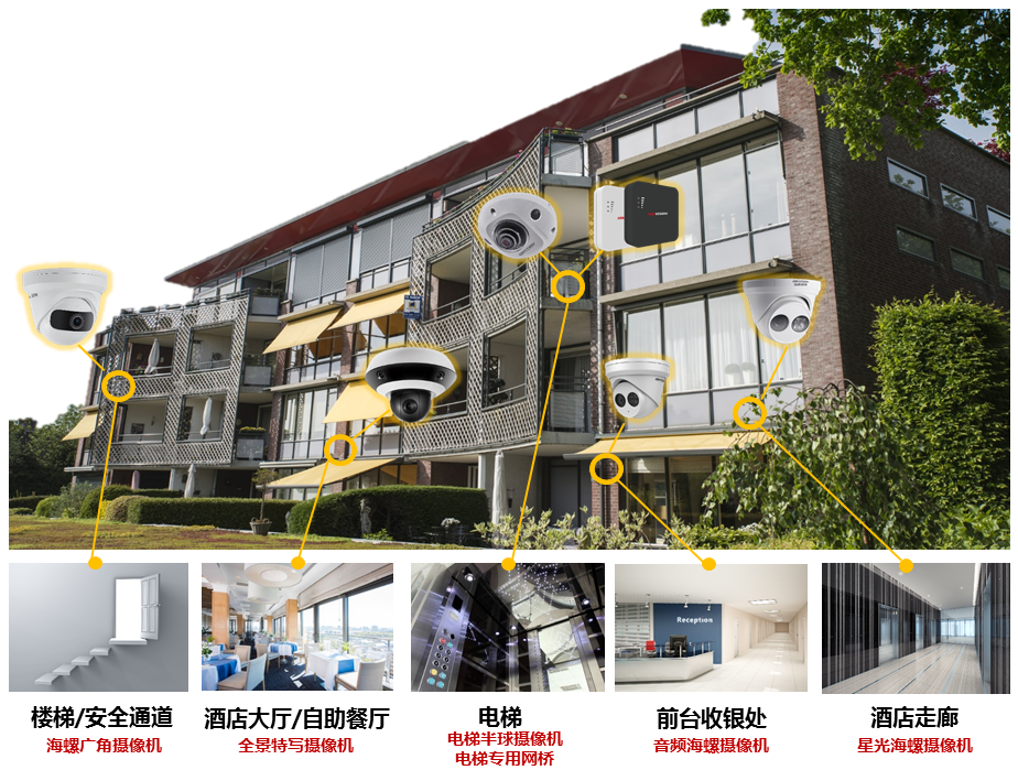 方案覆盖场景包括:前台收银区、前台大厅/餐厅、通道走廊/安全通道、电梯、客房等重点监控区域。其中: