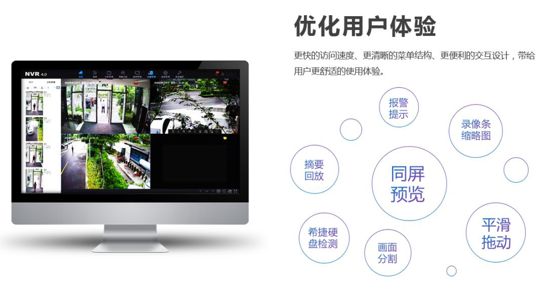 同屏预览功能可将监控画面中的目标人物显示在屏幕左侧,无需一一查看画面就对现场一目了然。人车分类检索功能让原本要找半天的录像,现只要几分钟就能快速定位事发录像,大大提高回查效率。