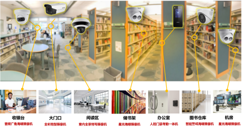 书店的阅读区采用3+1室内全景特写摄像机,外形美观,可360°全景监控,非常适用于阅读区等面积较大的区域,且摄像机的4倍光学变倍球机可快速捕捉画面细节,及时发现物品遗漏、占座纠纷等事件,保护读者的财产安全,营造良好的读书环境。