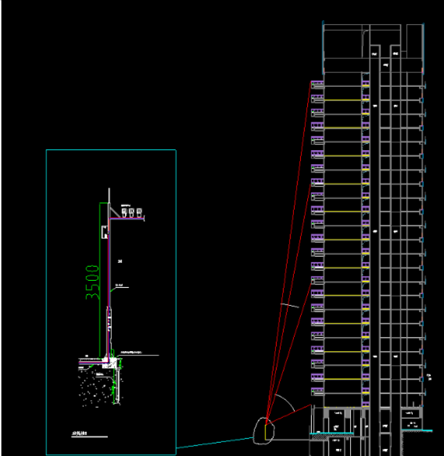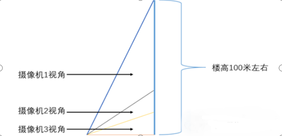 对于一个楼高在100米左右的大楼来说,可以通过3个相机进行覆盖,一个摄像机照0—15米的高度,一个摄像机照15-30米的高度,一个摄像机覆盖30-100米的高度,如下图: