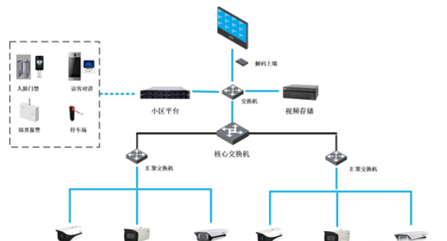 此方案中,前端设备选用不同的高清枪机,分别覆盖不同的楼层,摄像机通过局域网接入汇聚交换机,汇聚交换机可通过光纤接入核心交换机(或二层交换机),然后接入小区平台进行管理,大华小区管理平台可以无缝扩展门禁、对讲、停车场和报警等子系统,做到整个小区智能化的统一管理。后端也可采用免费管理软件SMARTPSS,无需配置平台,方案成本优势很大。
