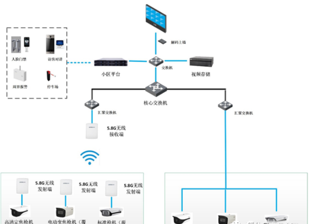 针对于一些无法部署有线网络或网络施工困难的点位,也可采用大华5.8G无线组网方案和有线方案相结合,方案架构如下: