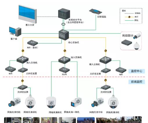 监控中心部分:监控中心采用磁盘阵列存储服务器将高清视频图像进行存储,解决数据落地问题;配置视频综合平台,完成视频的解码解码、拼接;监控中心部署LCD大屏用来将视频进行上墙显示等。系统可将模拟摄像机、网络摄像机和数字摄像机都接入到视频综合平台,实现统一的管理平台、统一的切换控制系统和统一的显示系统,实现对整个系统的统一配置和管理。