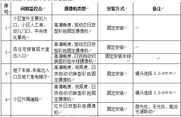 各住宅楼首层大堂出入口:摄像机对着出入口安装,由于摄像机处于逆光的安装环境,为了更加清晰监控进出人员和室外情况,因此采用超级宽动态、高清晰度、日夜型彩色摄像机、焦距变化范围在3.5~8mm的固定彩色摄像机;日夜自动转换型彩色固定摄像机;设备选型允许时优先选用半球机;