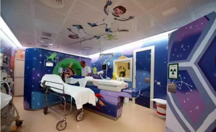 暖色系相对于纯白的墙壁更能给患者营造自然温馨的室内环境,缓解心理恐惧和压力。在特殊检查室中做木纹或者各种彩色图案的效果,可以保证病人们更加安心配合检查的同时,医生也能更好的检查。比如西班牙的巴塞罗那市的某医院与美国惠普公司携手打造的的“太空飞船”主题的磁共振室,星辰等图案遍布在室内的墙壁和核磁共振仪上,让患者在接受扫描时仿佛置身于太空船中。