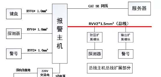 主机信号总线采用RVVP2*1.5型护套线;由于探测器报警信号传输速率低,电源电流小,报警输入模块至探测器信号线采用RVVP4*0.75型护套线,同时传输报警信号及12V探测器电源,报警输入模块至报警按钮信号线采用RVVP2*1.0型护套线。