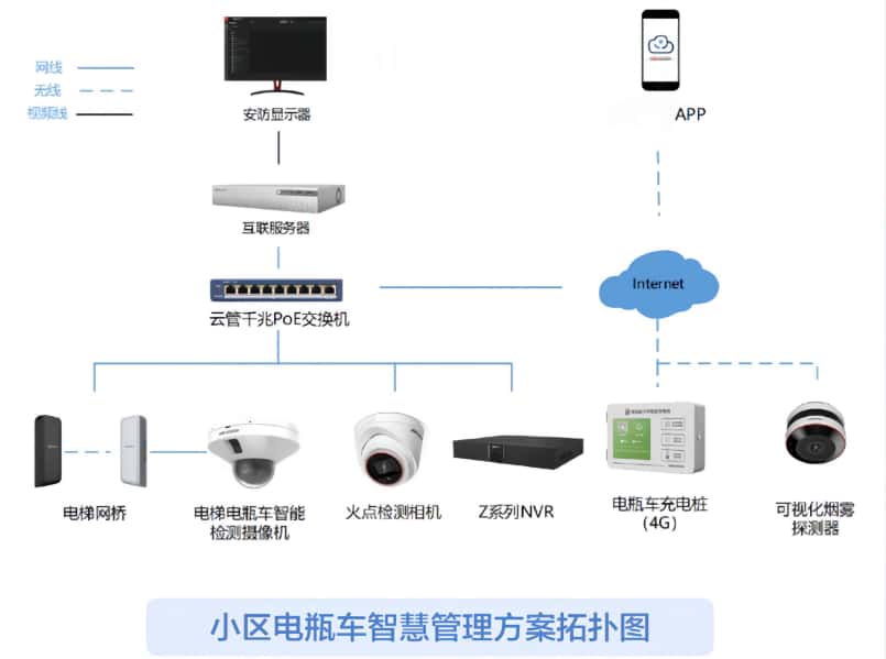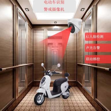 在小区电梯轿厢内安装电梯电瓶车智能检测摄像机,实时检测电梯桥厢内的情况,当发现电瓶车进入电梯,及时报警提醒。物业工作人员可授权摄像机的报警输出信号与梯控系统关联,当检测到电瓶车进电梯事件时,联动电梯不关门,直到电瓶车推出电梯后,电梯才会正常运行。