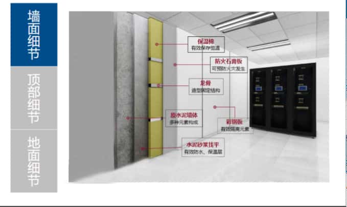 数据机房墙面的装修,多采用在原始墙体基础上构建轻钢龙骨隔墙的方式。此做法是在轻钢龙骨间内嵌隔音防火岩棉,其具备出色的隔音与防火性能,可有效减少机房内部噪音对外界的传播,同时在面对火灾隐患时,能发挥良好的阻燃作用。