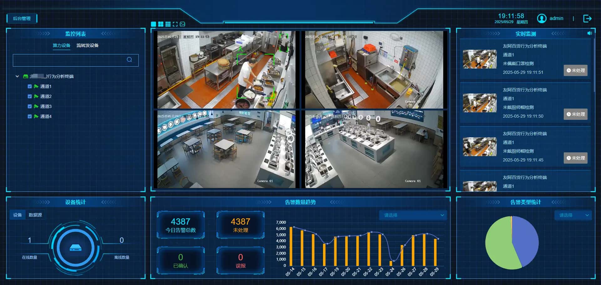 一旦系统发现任何不符合标准的情况,将立即触发预警机制。通过声光报警、手机推送、后台通知等多种方式,及时告知食堂管理人员,确保问题在第一时间得到关注与处理。