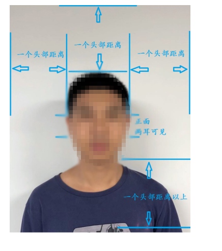 3、拍摄画面只有一个人,正面(人脸不偏、两耳可见、头部完全可见),拍摄距离1米左右,在图片中人的头部离左右上三边均要有一个头部的距离。
