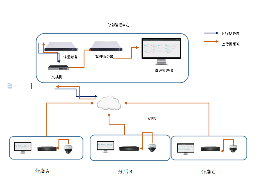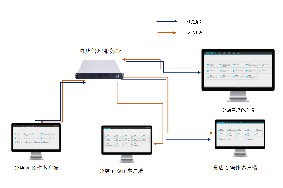 专网环境下,每个门店的管理客户端可远程连接位于总部的管理服务器;但每个门店的客户端登录者只具备操作员的权限(管理本门店设备的权限),只有总部的客户端登录者具备超级管理员权限(可对所有门店设备进行管理);