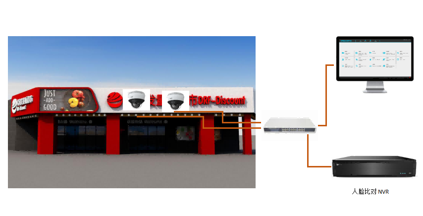 摄像机安装在超市的各个出入口内外各两台,共四台,建议采用半球摄像机,吸顶安装。人脸NVR可以用来对人脸IPC进行管理,也可以辅助作人脸比对功能;