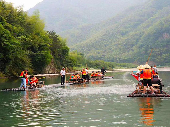水面上,大家一面划着竹筏,一面谈笑风生,享受着这难得的安逸时光。大家分享各自的工作生活,闲聊曾经的过往趣事,一路讴歌,一路笑语,在轻松愉快中,我们一起走过月亮湾的山山水水。