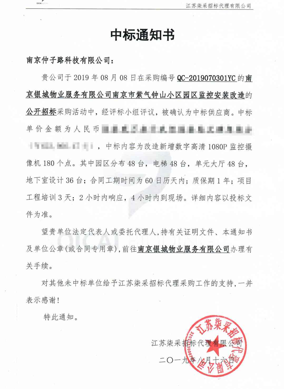 近日、我公司成功中标南京银城物业服务有限公司南京市紫气钟山小区园区监控安装改造工程项目。