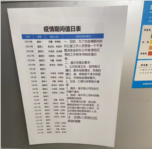 4、排出疫情期间值班表,各组值班人员每天早上对公司进行消毒打扫,通风换气,垃圾不隔夜,对公司全体员工进行全方位防护。