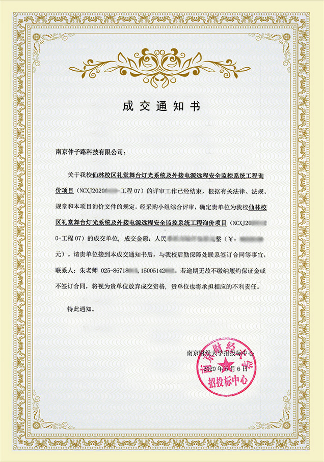 规章和本项目询价文件的规定,经采购小组综合评审,确定贵单位为我校仙林校区礼堂舞台灯光系统及外接电源远程安全监控系统工程询价项目(NCXJ2020042工程07)