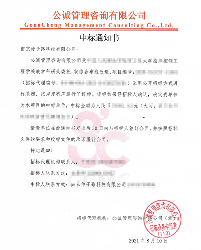 就在前几天我公司成功中标南京某大学综合布线改造工程