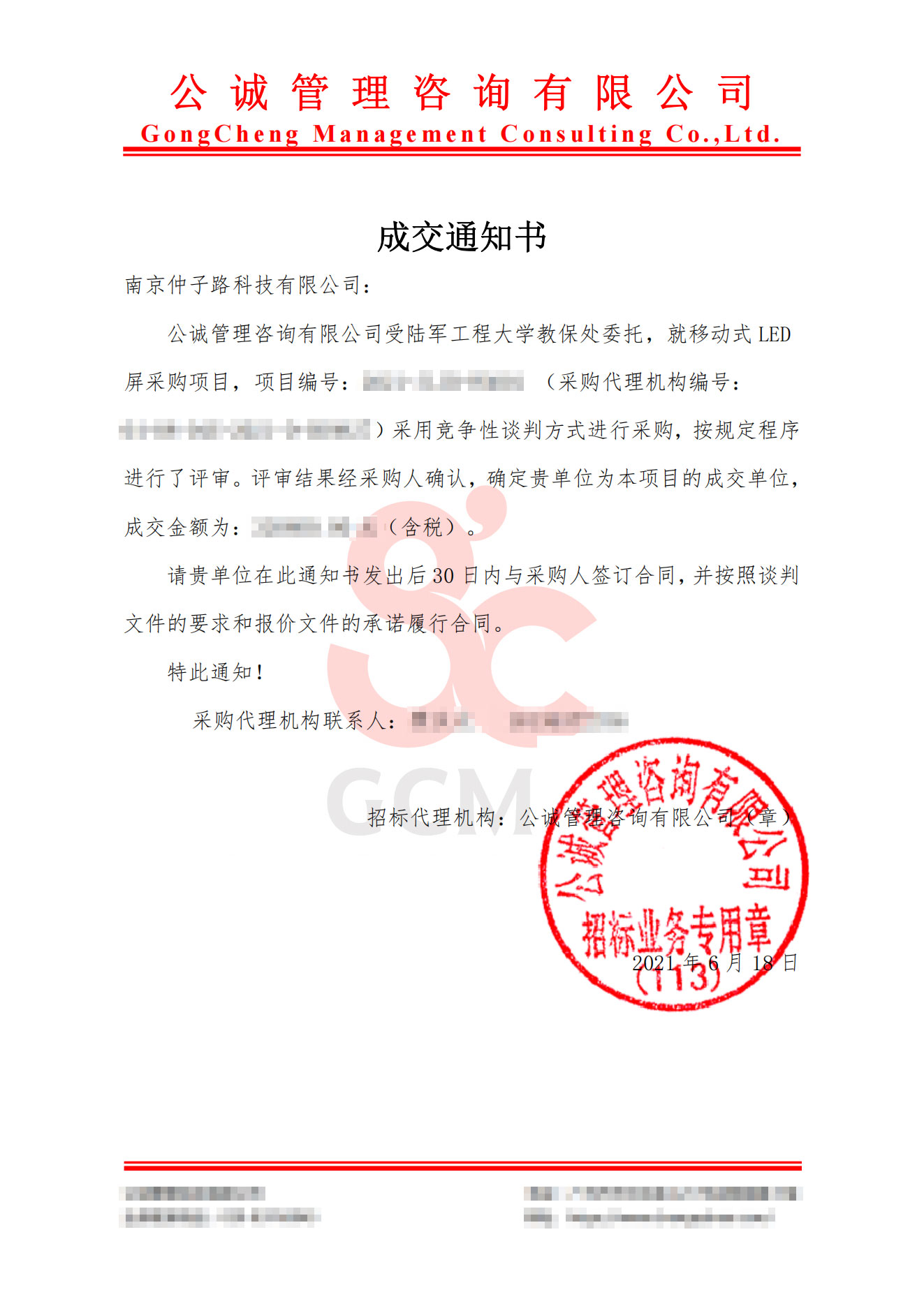 公诚管理咨询有限公司受某部队工程大学教保处委托,就移动式 LED屏采购项目,项目编号∶ xxxxx (采购代理机构编号∶xxxxx)采用竞争性谈判方式进行采购,按规定程序进行了评审。评审结果经采购人确认,确定贵单位为本项目的成交单位,成交金额为∶ xxxxx 元(含税)。