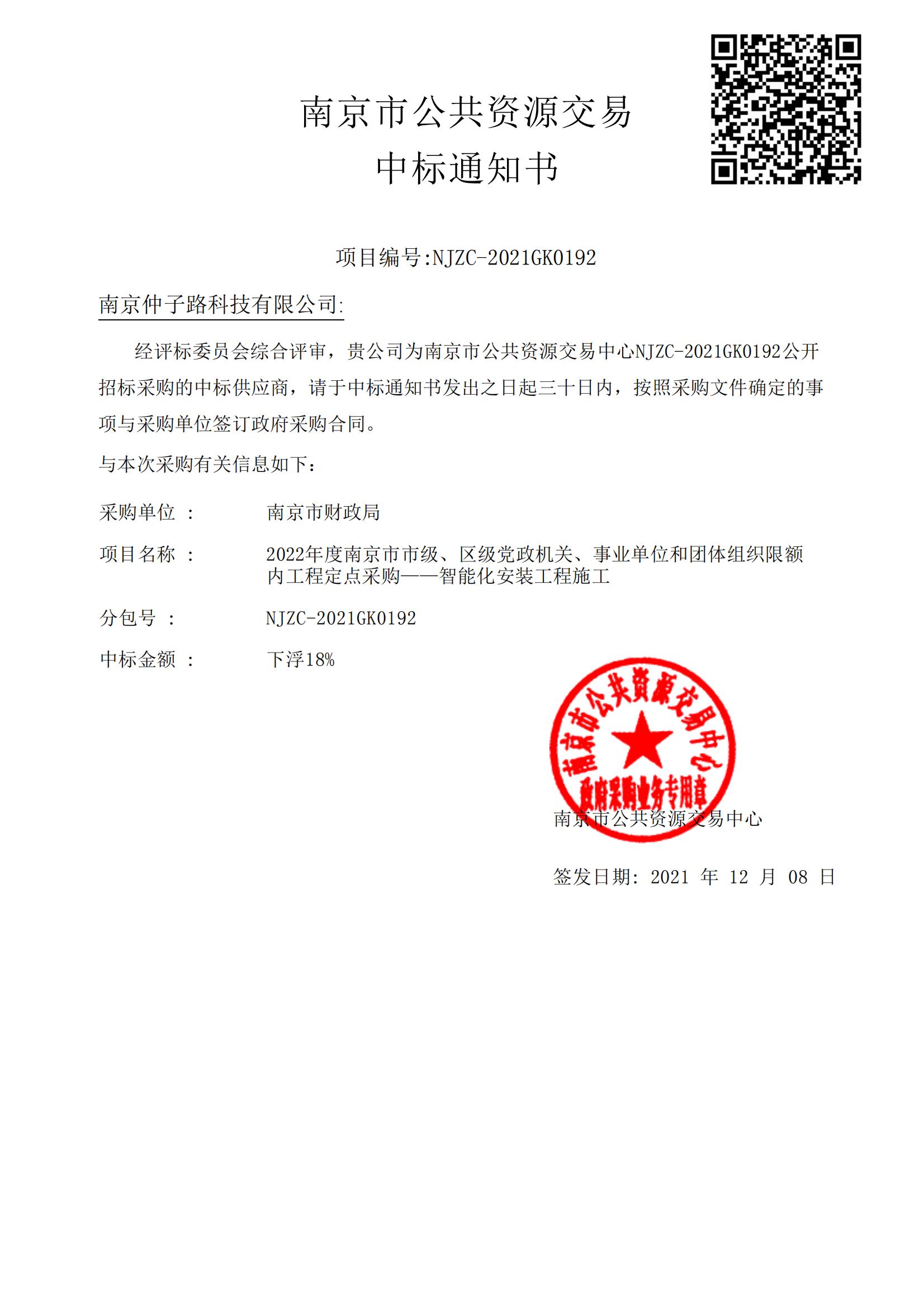 南京市政府部门中标通知书
