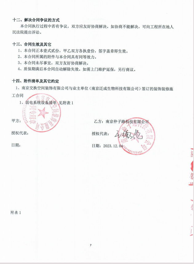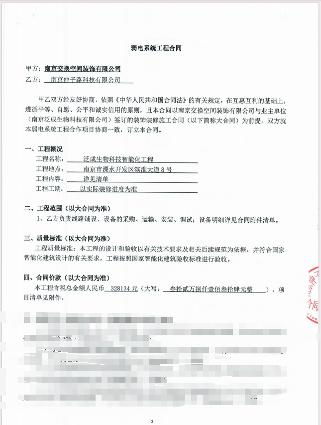 经友好协商,依照《中华人民共和国合同法》的有关规定,在互惠互利的基础上,遵循平等、自愿、公平和诚实信用的原则,与南京交换空间装饰有限公司与业主单位(南京泛成生物科技有限公司)签订装饰装修施工合同,双方就本弱电系统工程合作项目协商一致,订立本合同。
