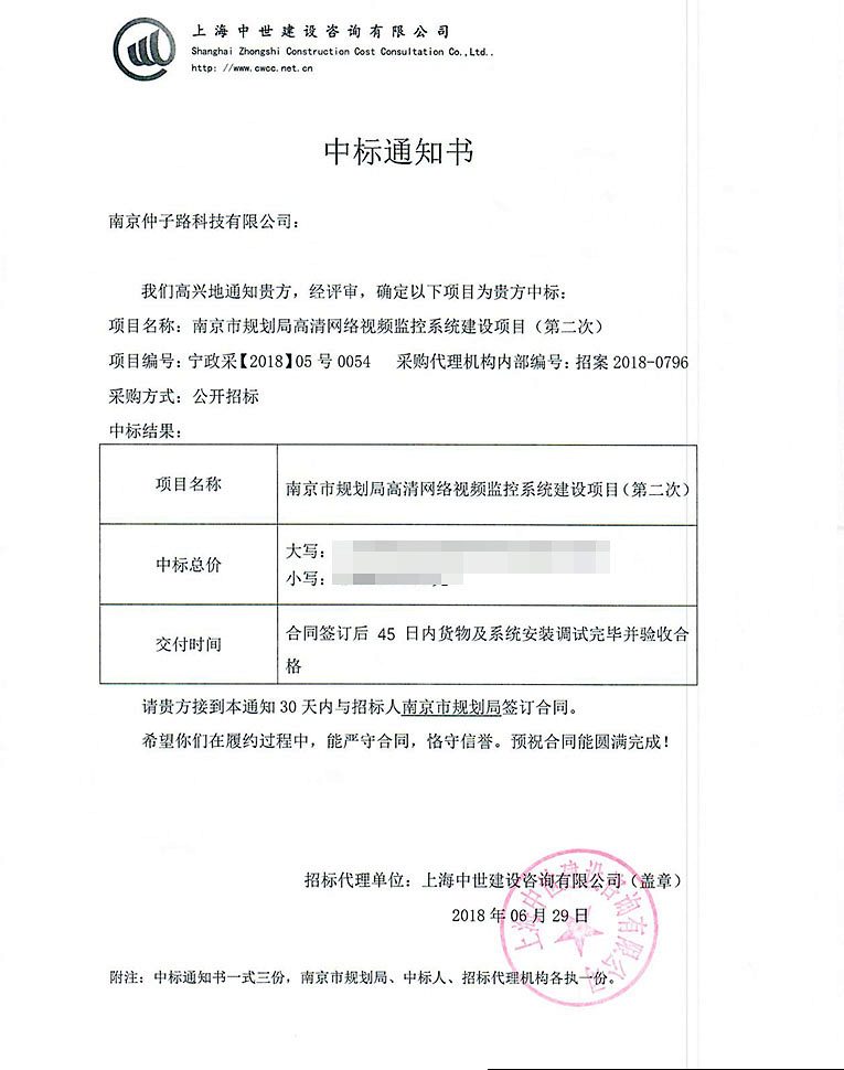 南京市规划局高清网络视频监控系统建设项目(第二次)中标