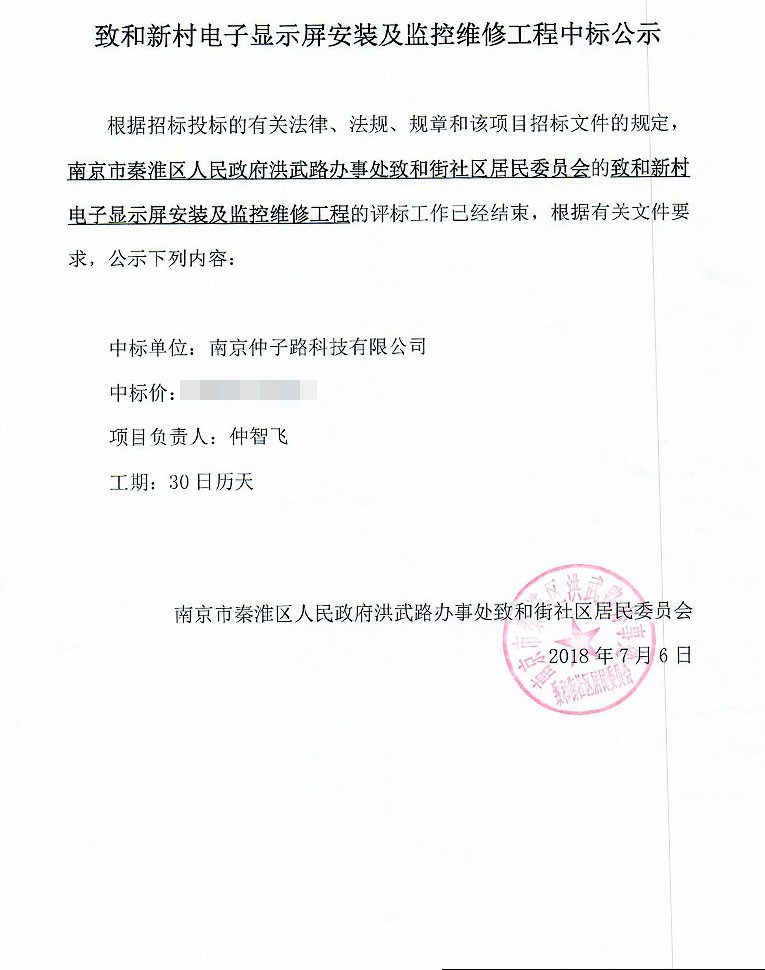 秦淮区洪武路办事处致和新村社区电子显示屏安装及监控维修工程、中标