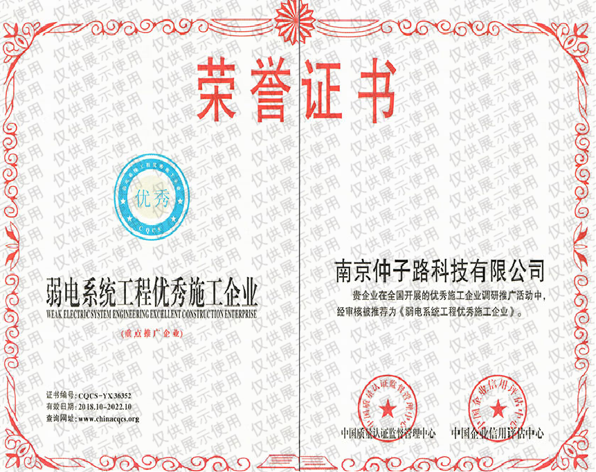仲子路智能成立与2007年,是专业从事智能化系统设计,施工和服务的集成商,20年专注于智能化系统、办公自动化系统、安防监控系统、综合布线系统、进出口管理系统、灯光音响系统、公共广播系统、LED显示屏系统、机房建设(改造,搬迁)等领域的工程业务、资质证书齐全主要包含:建筑智能化施工资质、城市及道路照明工程专业承包资质、安防工程企业资质。拥有权威机构授予的ISO9001质量体系认证、ISO14001:2015环境管理体系认证、18001:2007职业健康安全管理体系、高新技术企业证书、江苏质量诚信AAA品牌企业、行业领军先进企业,江苏优质诚信企业等荣誉称号等。