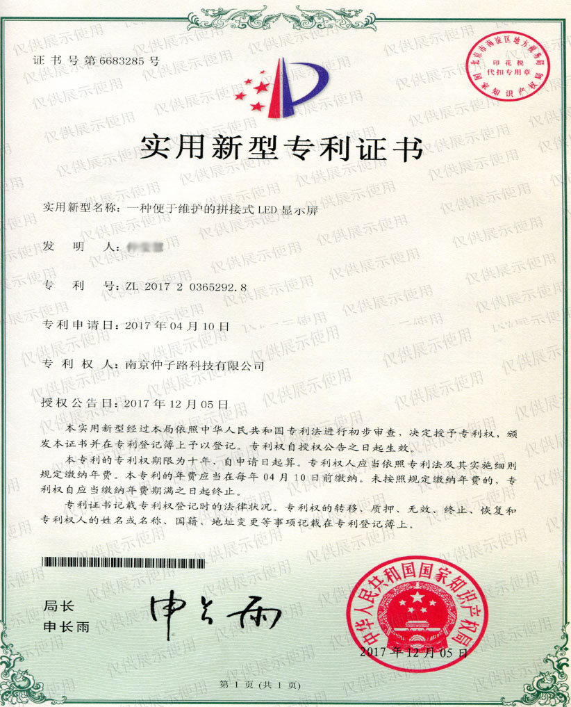 一种便于维护的拼接式LED显示屏实用新型专利证书