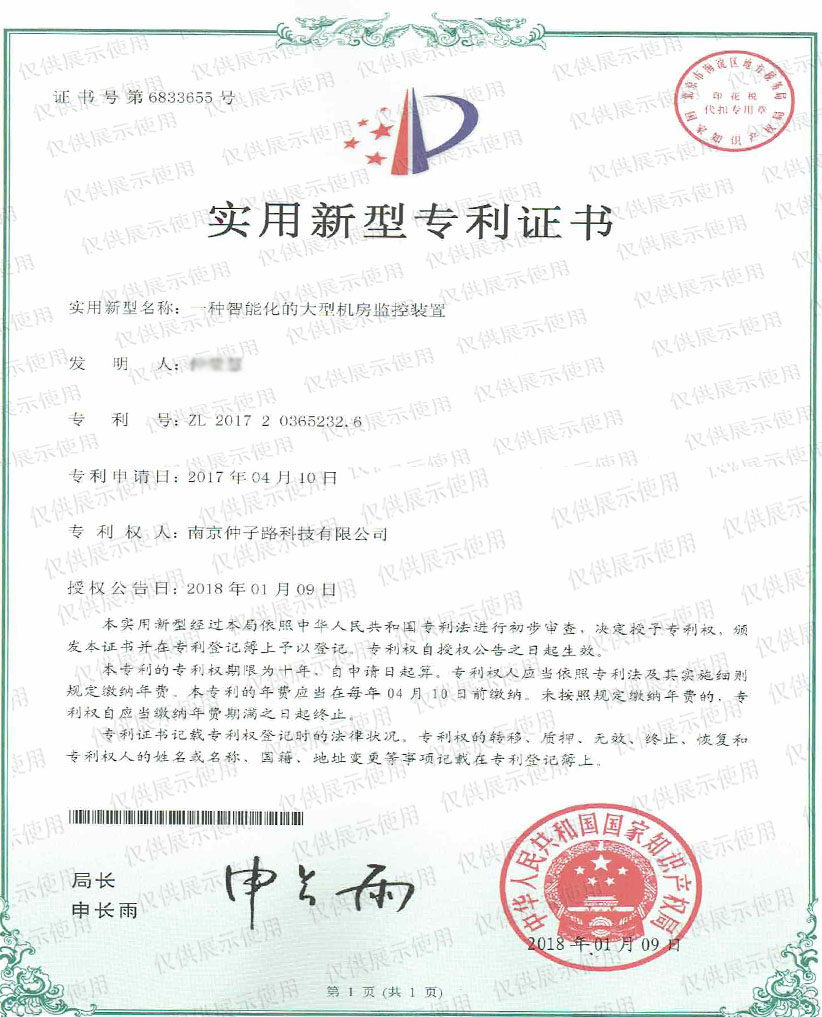 一种智能化的大型机房监控装置实用新型专利证书