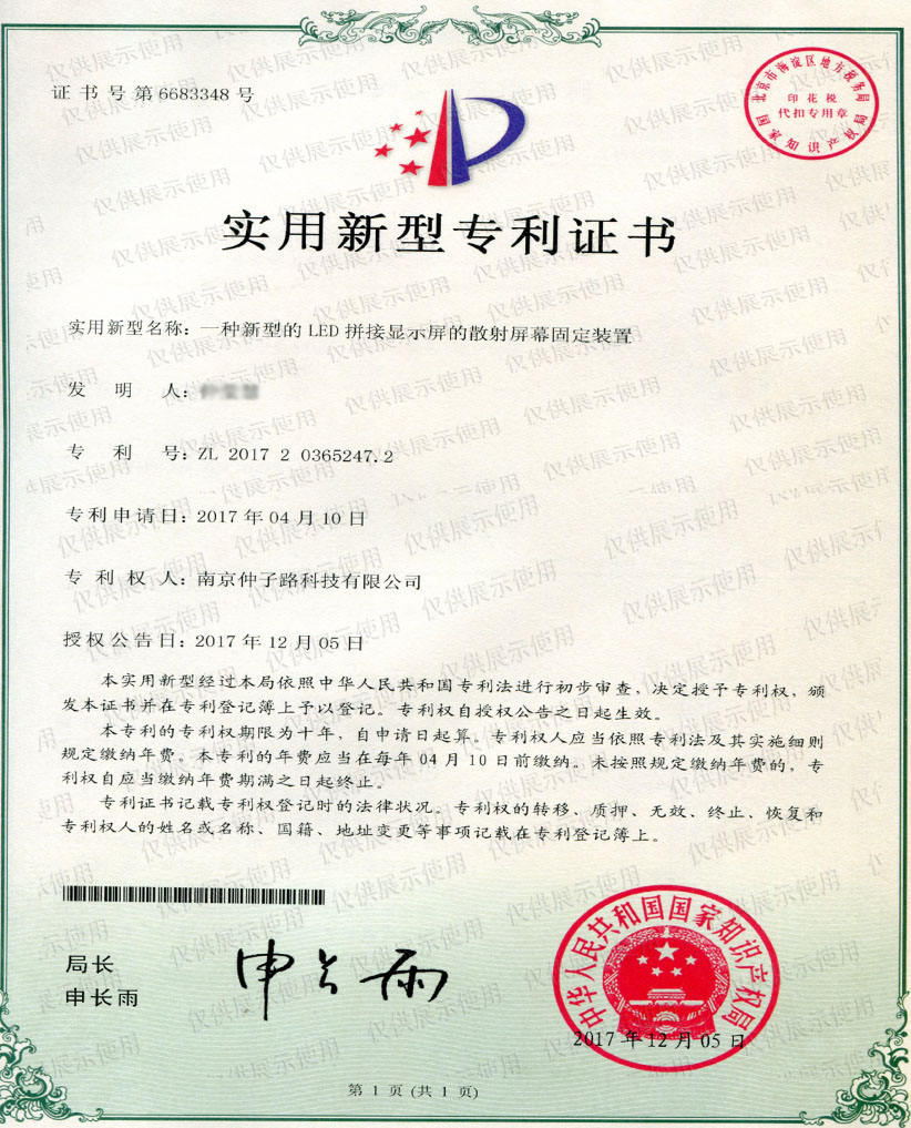 一种新型的LED拼接显示屏的散射屏幕固定装置型专利证书