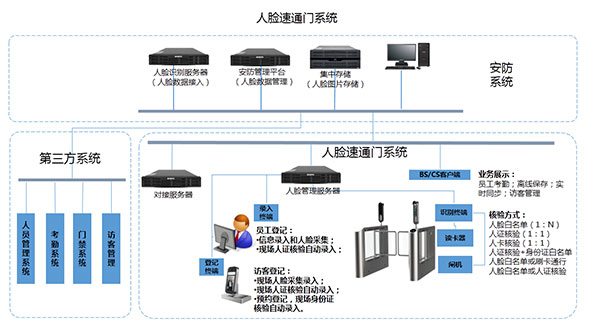 支持多种识别方式,即人脸识别加门禁卡识别、身份证识别、二维码识别等多种识别方式并存的方案