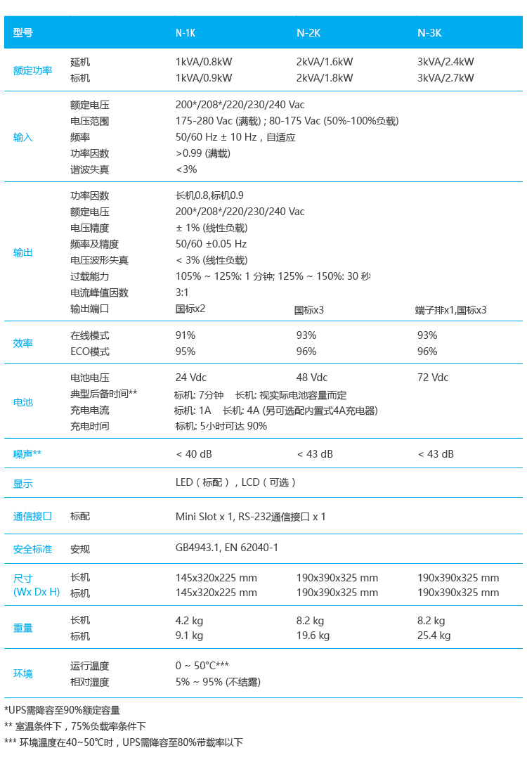 宽输入电压与频率范围,即使在恶劣的电力环境下,也能提供负载稳定的电源供应可减少电池放电次数,延长电池使用寿命